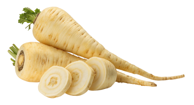 Fresh parsnips with sliced roots displayed on white background healthy vegetable nutrition focus