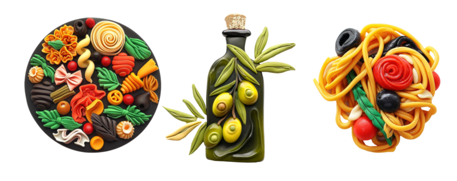 Refrigerator clay magnets decoration set. Traditional italian food collection