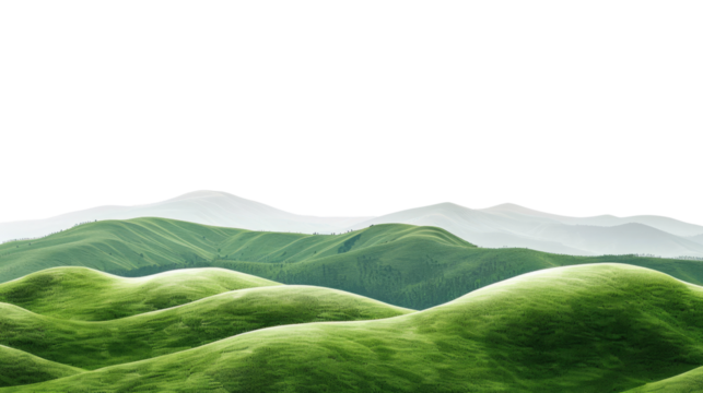 Panoramic view of lush green rolling hills and mountain ranges isolated on transparent background