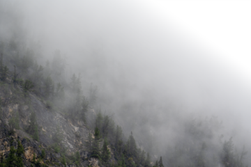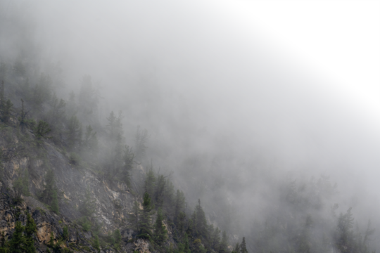 Foggy forest creating a mysterious atmosphere with trees dissolving in thick mist, monochrome nature background with transparent areas