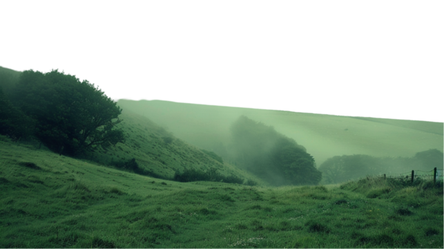 Rolling green hills with scattered trees under a hazy sky isolated on transparent background