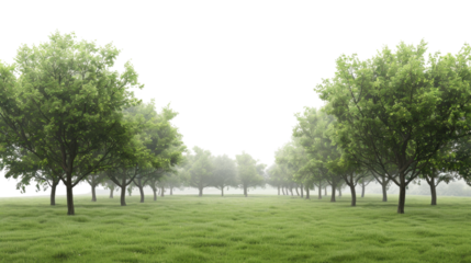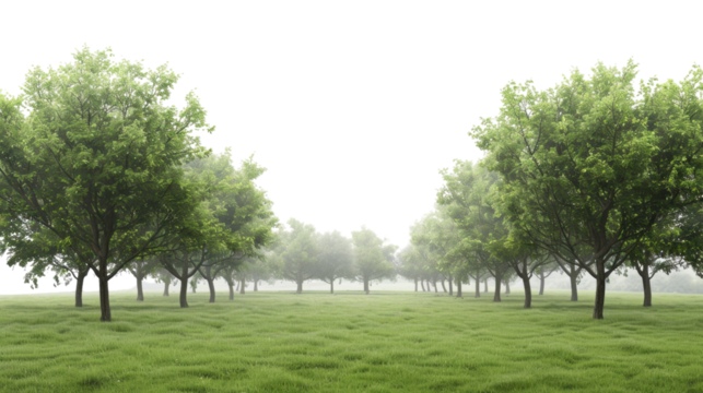 Green trees growing in misty meadow with transparent background