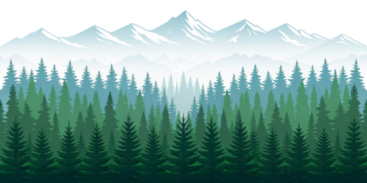 Scenic mountain landscape with lush green forest and river, isolated on transparent cutout background