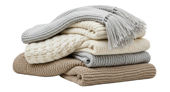 Stack of cozy folded knitted blankets in neutral tones