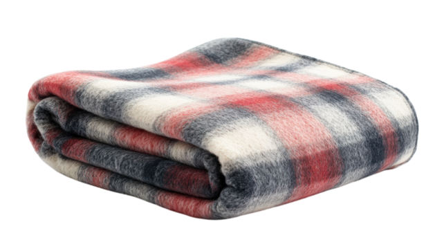 folded warm wool checkered plaid blanket, png file of isolated cutout object with shadow on transparent background.
