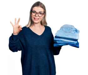 Young blonde woman holding stack of folded jeans doing ok sign with fingers, smiling friendly gesturing excellent symbol