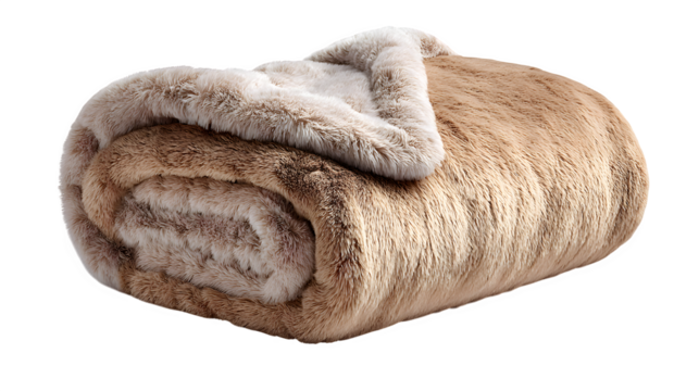 Folded faux fur throw blanket, dense fibers and fluffy edge, warm soft light, isolated on white background