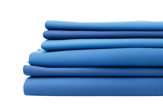Pile of blue folded fabric isolated on white background, neatly stacked. Concept of textile, bedding, or material for sewing and crafting. Ai generative
