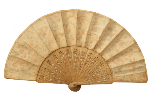 Vintage handheld fan on transparent background, ornate, cream and beige