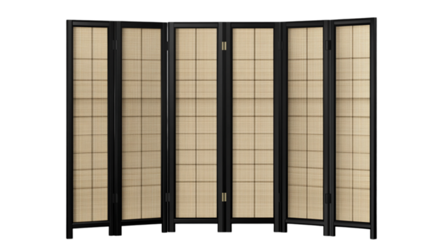 Japanese Style Black Folding Screen Room Divider with Woven Panels Isolated on White Background