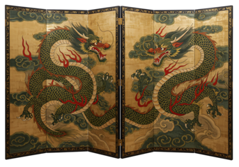 A folding screen painted with confronting stylized dragons amid swirling clouds against a goldtoned background