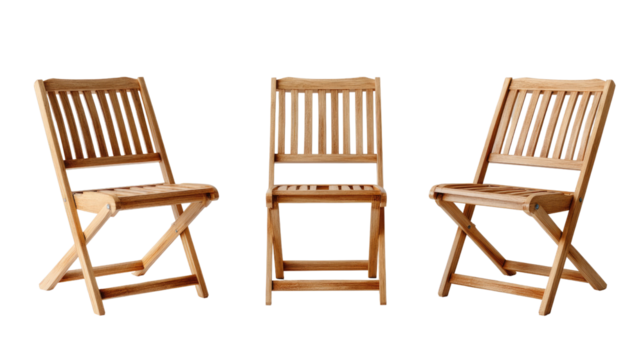 Teak Folding Chairs: Three minimalist teak folding chairs stand side by side against a clean white background, showcasing their simple yet elegant design.
