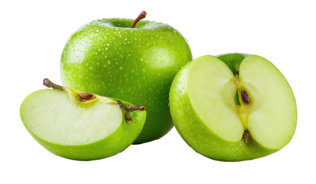 A close-up depicts three green apples, one whole, a half, and a slice, on a black background