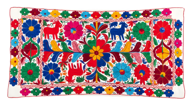 Colorful suzani textile isolated on transparent background, a vibrant display of traditional folk art with intricate floral and animal motifs, handembroidered