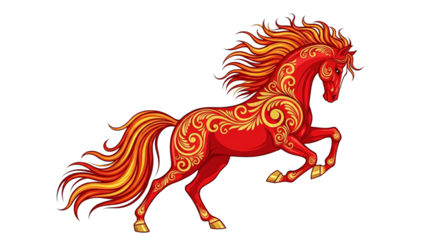 Majestic Rearing Red Horse With Golden Folk Art Patterns