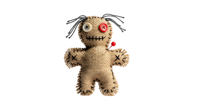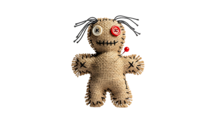 Isolated decorative handmade yarn doll, straw scarecrow figurine with green and yellow accents