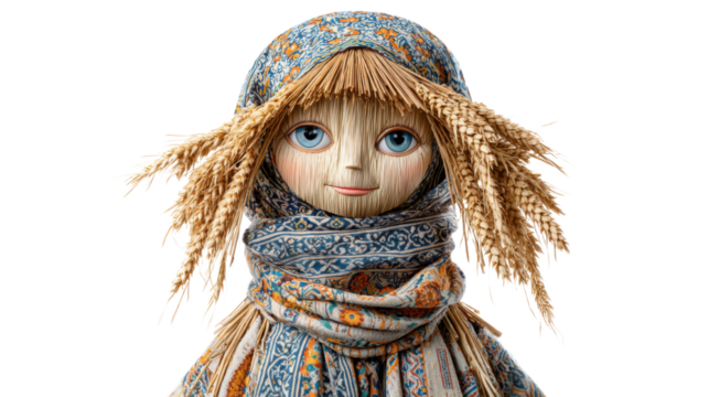 Handcrafted straw doll character with wheat hair folk art rustic decoration traditional costume fantasy figure studio portrait on white background