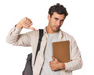 Hispanic student holding notebooks in studio feels proud and self confident, example to follow.