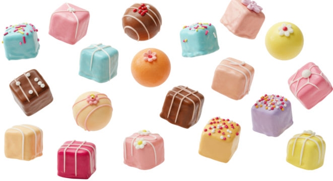Miniature French petit fours with unique shapes, glossy pastel/bright fondant glaze, intricate decorations, and sprinkles, floating on a transparent background with copy space, sweet dessert