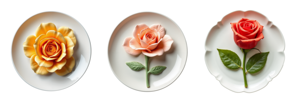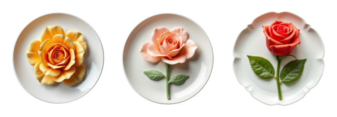 Set of beautifully crafted sugar flowers made from colorful fondant placed on white plates against transparent background