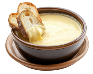 Swiss cheese fondue with bread cubes for culinary and hospitality industry use - transparent background png