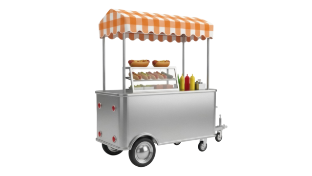 Isolated silver hot dog cart selling hot dogs, with orange and white striped awning design