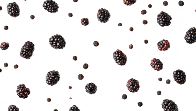 A flat lay of fresh blackberries scattered on a clean white background. their rich color and texture. ideal for food photography. recipes. or healthy lifestyle content