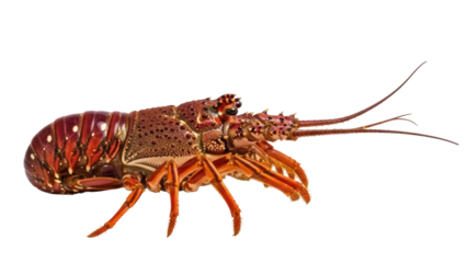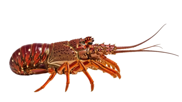 A large lobster is shown in a close up. The lobster is red and orange with black spots, png