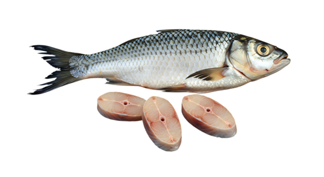 fresh whole rohu carp fish with raw steaks - healthy seafood isolated on transparent background