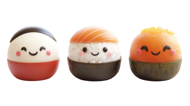 Three Japanese kawaii food characters with faces on sushi mochi and dango on transparent background