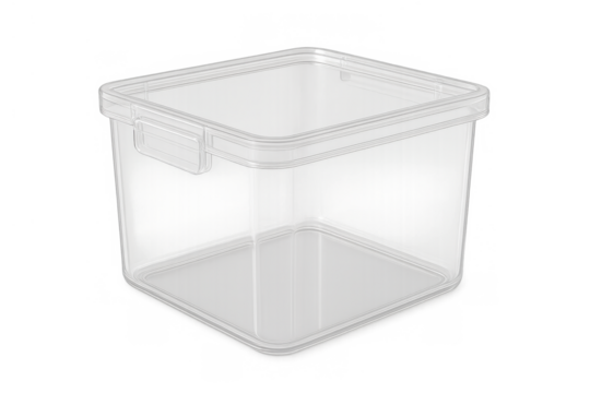 Clear plastic food storage container with lid, empty, for kitchen organization and meal prep against transparent background