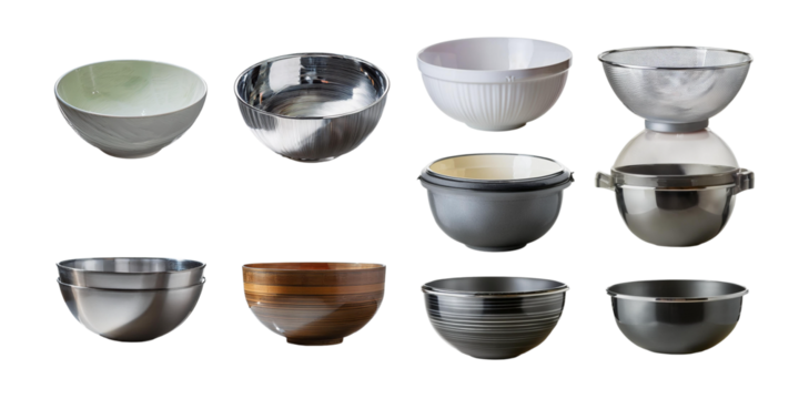 Collection of assorted mixing bowls made from various materials, including metal, ceramic, and bamboo, ideal for food preparation, isolated on transparent background.