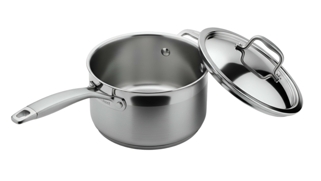 Shiny stainless steel saucepan with handle and lid, presented against a black backdrop