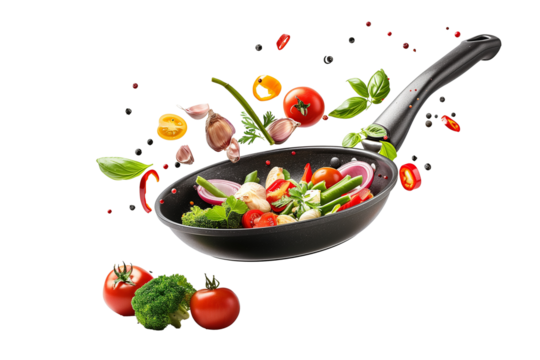 Cooking Italian pasta with vegetables flying over a hot frying pan isolated in white.