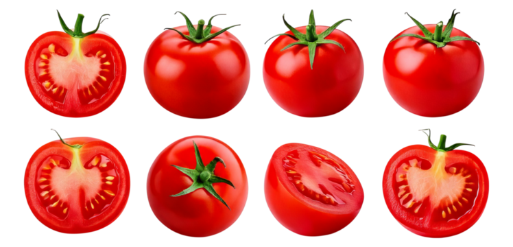 Fresh Red Tomatoes Displayed in Multiple Angles and Cuts, Isolated on Transparent, white background