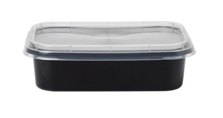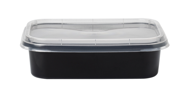 Clear rectangular plastic food storage container with a secure sealing lid isolated on a black background for kitchen organization purposes