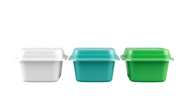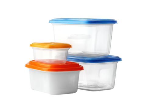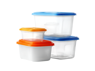 Clear plastic food storage containers with blue and orange lids image, Isolated, Png Transparent Background