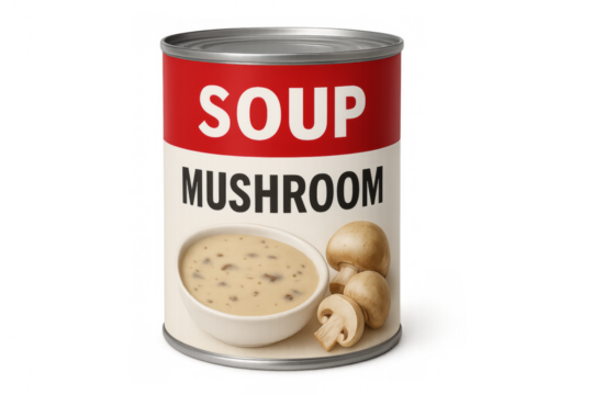 Mushroom soup can with transparent background displaying flavor and ingredients