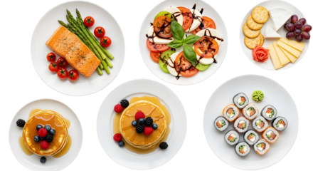 Assorted dishes including sushi, pancakes, and salmon served on plates in a png image
