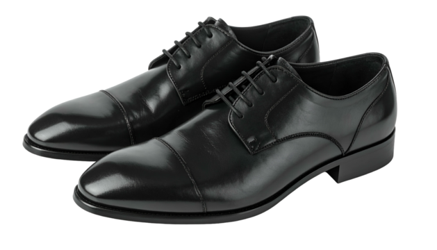 A pair of polished, black leather dress shoes, side view, on a transparent background