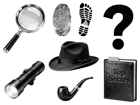 Detective Mystery Illustration: Magnifying Glass, Footprint, Question Mark, Hat, Torch