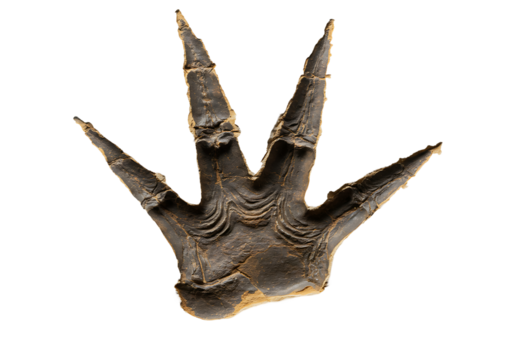 Dark fossilized dinosaur footprint w prominent claws against a black background Geological find