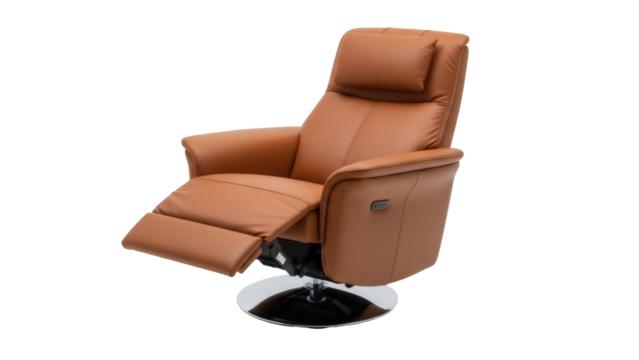 Comfortable caramel-colored recliner chair isolated on a clean backdrop, modern armchair with extended footrest for relaxation and home decor