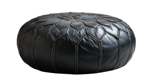 Black Moroccan leather pouf ottoman displayed on a white background