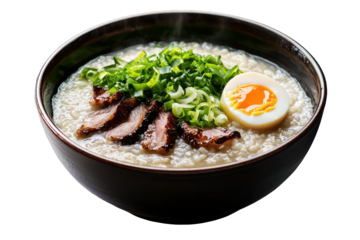 Steaming Bowl of Savory Rice Porridge with Tender Sliced Pork, Soft-Boiled Egg, and Fresh Green Onions. A Comforting Asian Meal, Ready to Enjoy.