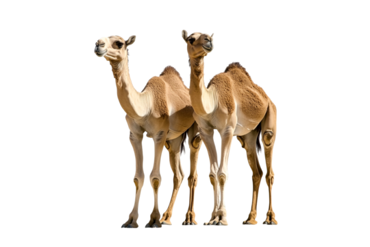 Two camels standing side by side against a plain white background showcasing their unique features and forms