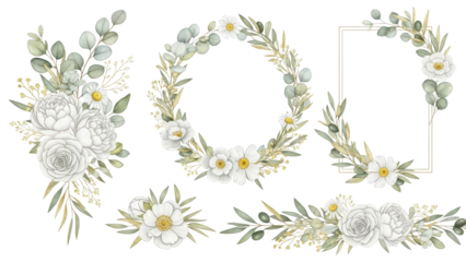 Watercolor floral illustration set   bouquets, frame, border White flowers, rose, peony, gold green leaf branches collection Wedding invites, wallpapers, fashion Eucalyptus olive  leaves chamomile