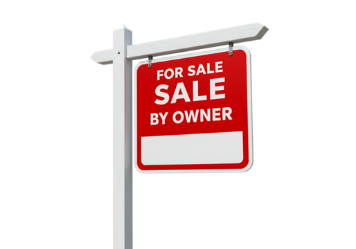Red and white real estate for sale sign on a black pole isolated on transparent background