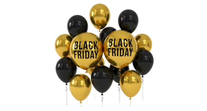 Black friday sale balloons gold and black promotional image on transparent background