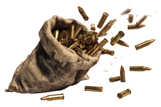 Bullets spilling from a burlap sack.  War, conflict, danger concept.